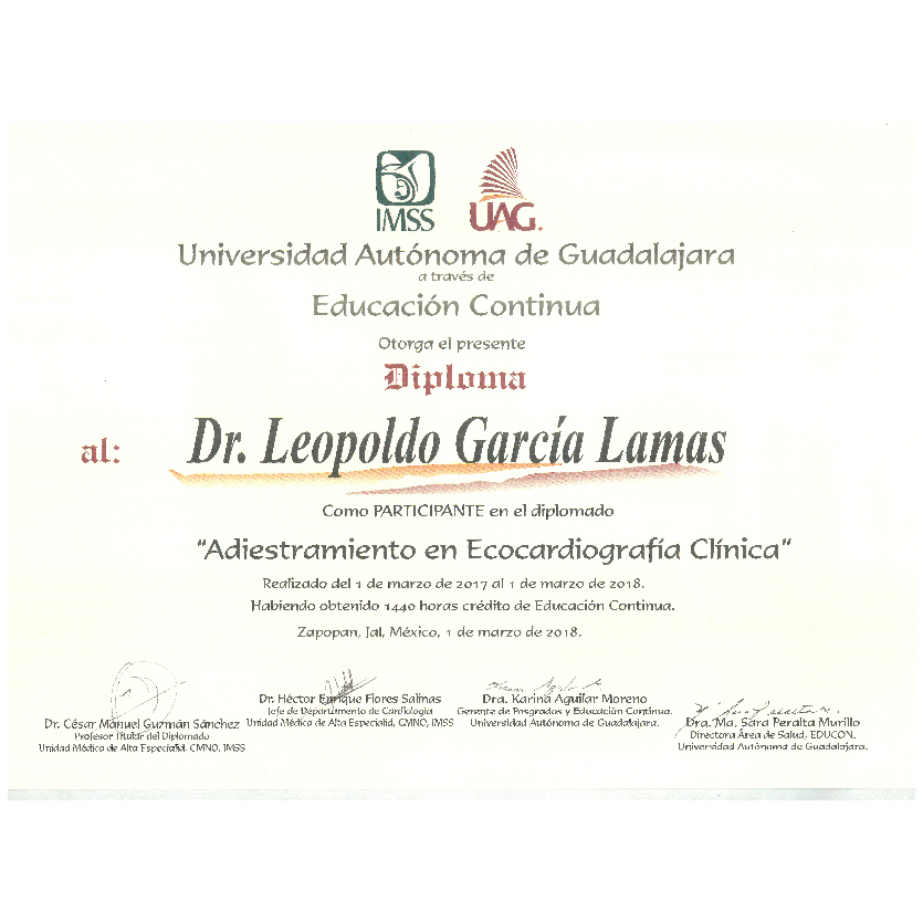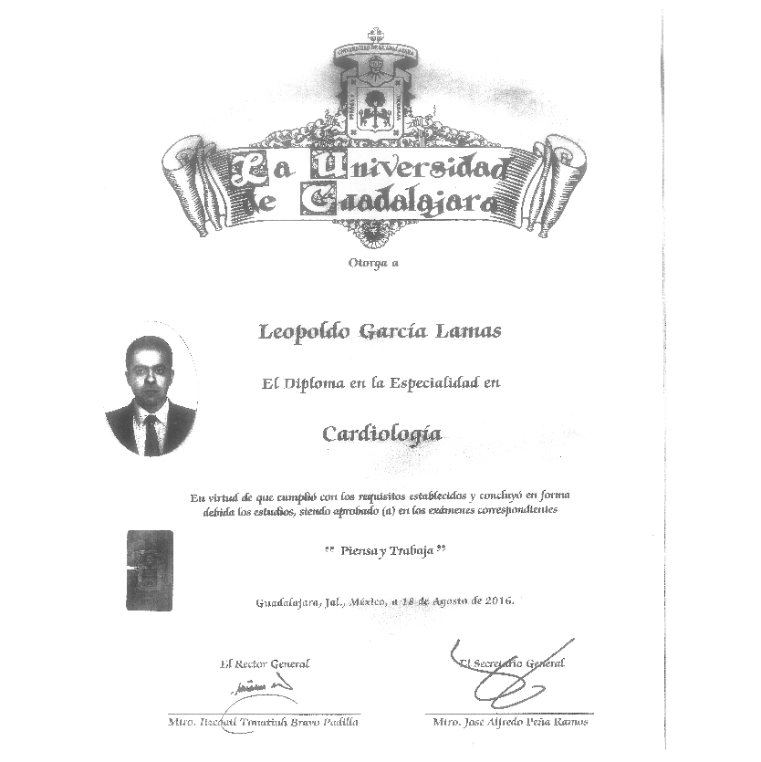 Cardiólogo, con estudios realizados en Centro Médico Nacional de Occidente,